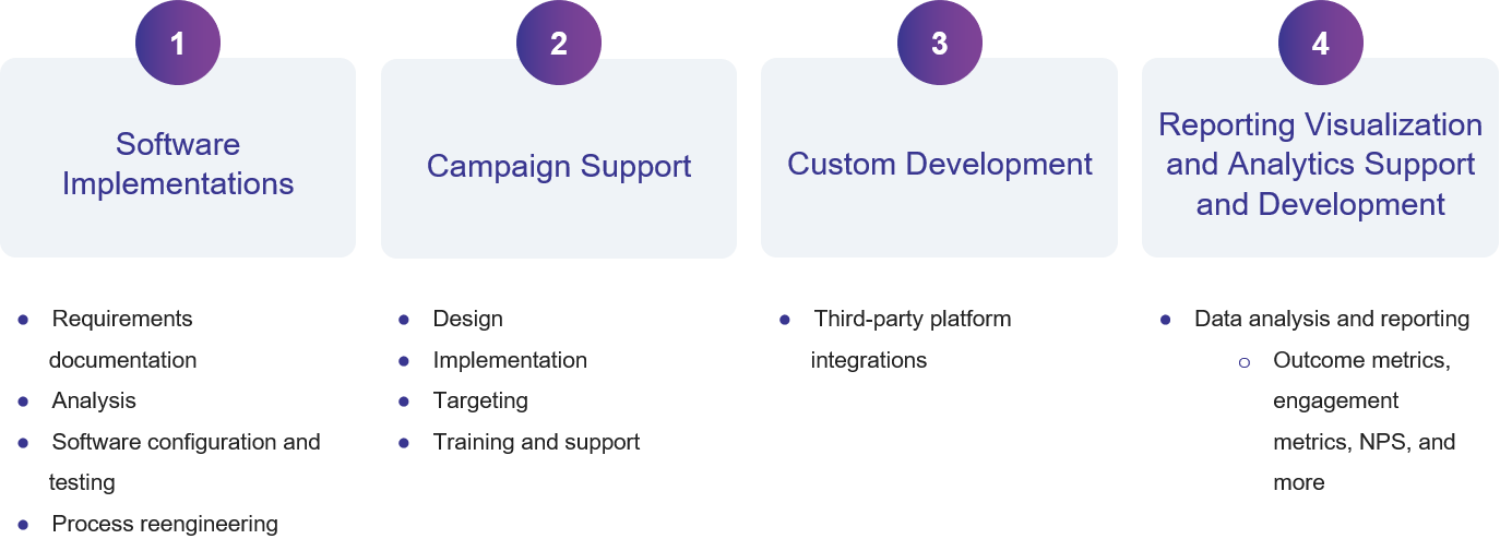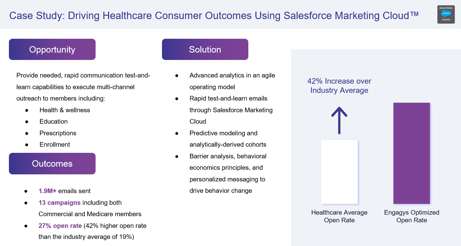 Using our expertise in healthcare consumer engagement and digital transformation, we focus on projects related to Health Cloud, Marketing Cloud and Community Cloud. We provide software configuration and implementation services, direct-to-consumer campaign design and outsourcing services, architecture and integration services, and data science and analytic services to providers and payers who are striving for a consistent and well-orchestrated consumer experience.